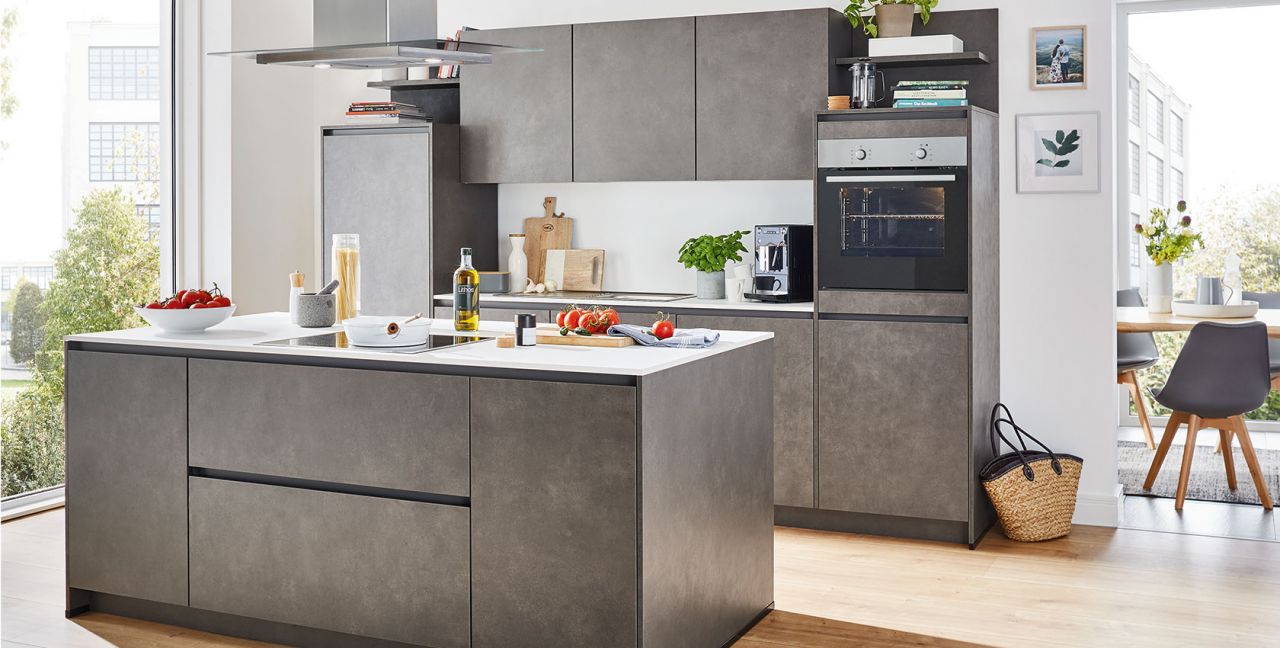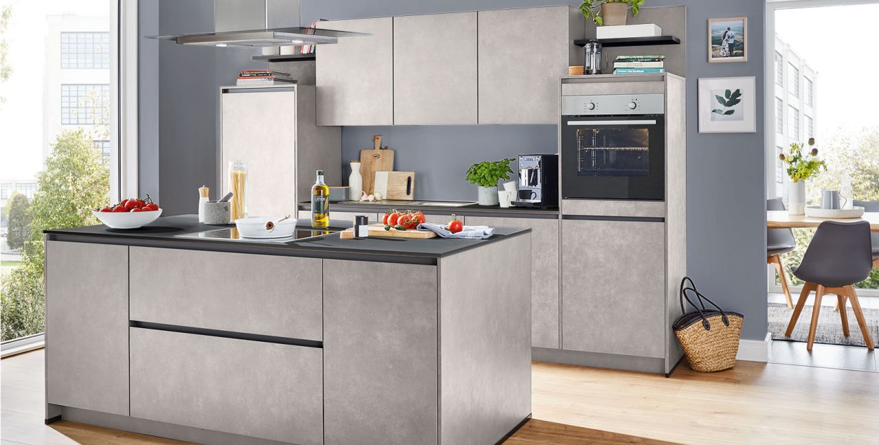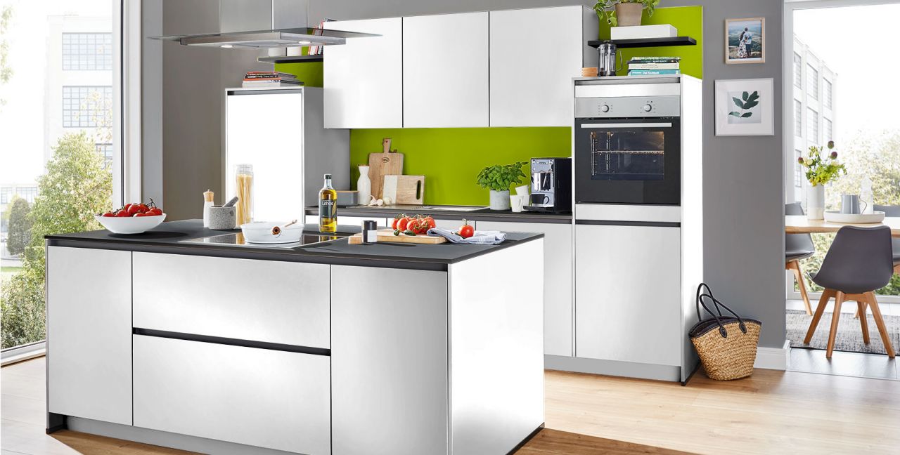 Inklusive Einbaubackofen Edelstahl Laurus LEB5 Energieeffizienzklasse A, Glaskeramik Kochfeld Laurus LCA600, Inselesse Edelstahl / Glas Elica TRIBE INSEL-A Energieeffizienzklasse A, Kühlschrank Laurus LKG88E Energieeffizienzklasse E, Einbauspüle Edelstahl Rodi Okio Line 85 Deep, XL-Schränken, Unterschrank mit Großraumauszügen, Wandborden.